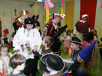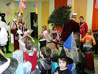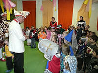 Dreigestirn, Dorfgemeinschaft und das Gefolge des Dreigestirnes im katholischen Kindergarten zu Besuch