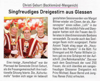 Glessener Dreigestirn und Kippesänger in Kerpen-Sindorf Für den MGV - aus dem das 12. Glessener Dreigestirn kommt - ist es schon Tradition auf der Pfarrsitzung in Kerpen-Sindorf aufzutreten. Allerdings treten hier nur die Glessener Kippesänger auf, d.h. eine kleine Formation, die sich aus den Reihen der Männer des MGV gebildet hat. In diesem Jahr ist alles anders: zuerst gingen die Männer aus dem MGV voraus, gefolgt von dem Schmölzje des Dreigestirnes und zum Schluss Prinz Michael I., Bauer Bernd und Jungfrau Renée. Zuerst präsentierte sich das 12. Glessener Dreigestirn - vorgestellt vom Prinzenführer Achim Franzen - mit Prinzenrede und dem Leed "Mir sin esu jeck" bevor im Anschluss die Kippesänger mit Prinz Michael I., Bauer Bernd und Jungfrau Renée mit den Kippesängern Kölsche Leedcher präsentierten. Nach Zugaben wurden die Glessener Kippesänger mit Chorleiter Hans-Josef Pütz von der Bühne gelassen. Auch Diakon und Sitzungsleiter Phillip Börsch hatte seinen Spass an diesem fullminanten Auftritt. Quelle: 04.02.2008 / Sabine Henry |
