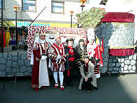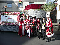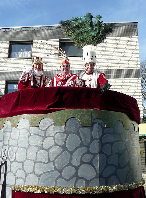 Der Festwagen mit Jungfrau René, daneben Adjutant Manfred und Bauer Bernd - hinten Prinz Michael I, Präsident Gerd Lieven und Prinzenführer Achim