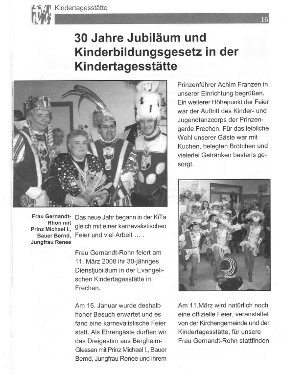 überrascht. Auch eine Rede bzgl. der Widrigkeiten vom Prinzen Michael I. folgte: die Jungfrau aus Glessen hat nur ein Haarteil, welches täglich in Form zu halten ist, während andere Lieblichkeiten mehrere Haarteile hätten. Auch das Ornat der Jungfrau hat schwer gelitten und musste repariert werden. Die Glessener Tollitäten sin wirklich esu jeck um jeck zo sin. siehe Bericht im Kölner Stadtanzeiger vom 31.01.2008 Quelle: Sabine Henry / 04.02.2008